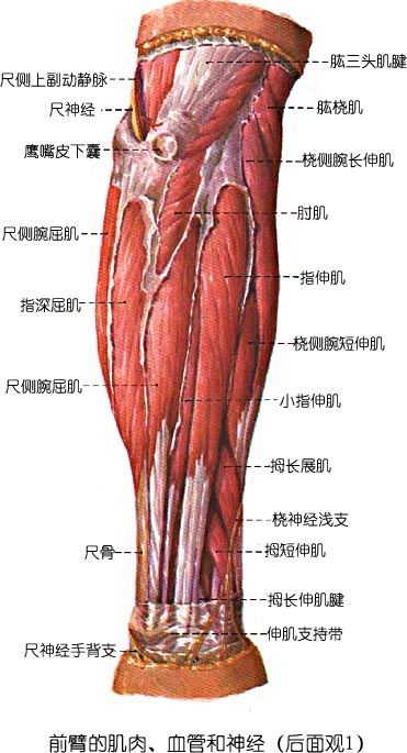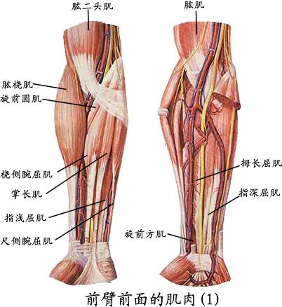 比较复杂,位于桡、尺骨周围,包括前后两群,每群又可分为浅、深两层。前群一般为屈肌(屈肘、屈腕、屈掌、屈指)或旋前肌(前臂旋前),后群一般为伸肌(伸肘、伸腕、伸掌、伸指)或旋后肌(前臂旋后),每块肌的功能多与名称一致。