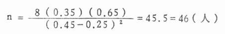 性气管炎患者,近控率甲药为45%,乙药为25%。现拟进一步试验,问每组需观察多少例,才可能在α=0.05的水准上发现两种疗法近控率有显著相差?