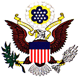 The main body is the old age hawk which in front of a chest has the shield shape design. The old age hawk is the American national bird, it is the strength, the courage, the freedom and the immortal symbol. The shield surface upper half for the blue color horizontal rectangle, gets down the half for the vertical strip which is red, alternates with in vain, its implication with national flag. Above the hawk goes against the crown symbol to be born in the world sovereign state a new independent national - United States of America; Goes against in the crown to have 13 white five pointed stars, represents American initial 13 states. Hawk's two fingernails separately grab the olive branch and the arrow, symbolic peace and the military force. The hawk mouth is holding in the mouth on the decadent colorful silk ribbon writes with Latin "is gathering the audiences is one", Italy is composed for the United States of America by very many states, is a complete country.