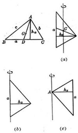 center of gravity Moment of inertia ( a ) The axis of rotation passes through the center of gravity G and is parallel to side a ( Figure ( a )) ( b ) the axis of rotation coincides with the side a of the triangle ( figure ( b )) ( c ) the axis of rotation passes through a vertex A of the triangle and is parallel to side a ( figure ( c ))