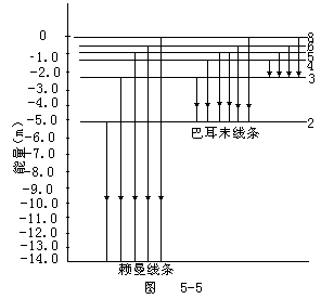 可知,n越大,原子系统Wn的绝对值越小,但代数值越大,亦即电子离核越远,原子能量越大。电子在第一轨道亦即最内层轨道(n=1)时,能量最小,原子最为稳定,这种状态便是基态。量子数n大于1的各个状态,其能量均大于基态能量,这些状态都是激发态。当原子由基态跃迁到受激态时,原子必须吸收一定的能量。例如原子受到辐射的照射或高能粒子的撞击等,这时电子可由第一轨道跃迁到量子数较高的轨道上运动。处于受激状态的原子一般在10-8秒内自发地跃迁到能量较低的受激态或基态,在跃迁过程中,将发射一个一定频率的光子,其波数由
