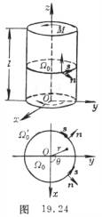 [圆柱的扭转] 圆柱的半径为R,圆柱的中心轴取作z轴,两端为z=0,z=l,体力不计.首先考虑只在两端截面受相反的力偶矩M(图19.24)而产生的扭转变形.一般可假定只有沿各横截面产生抗扭的剪应力而其余的分量