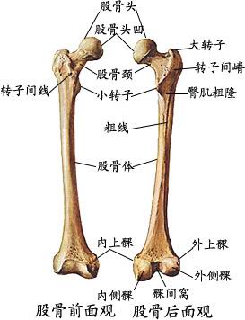 (2)股骨:是人体最粗大的长骨。 (2) Femur: It is the body's most thick long bones. 主要结构有股骨头、股骨颈、股骨体、大转子、小转子、内侧髁、外侧髁等。 The main structure of the femoral head, femoral neck, body, greater trochanter, lesser trochanter, medial condyle, lateral condyle and so on.