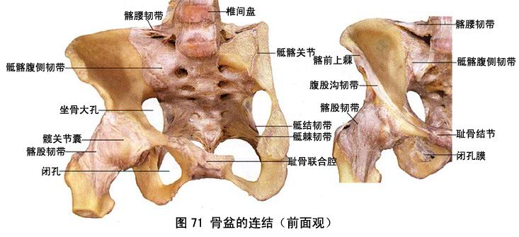 1)构成:由骶骨、尾骨和左右髋骨借骶髂关节、耻骨联合及韧带而构成。 1) composition: the sacrum, coccyx and left hip by the sacroiliac joints, and ligaments of the pubic symphysis and composition.