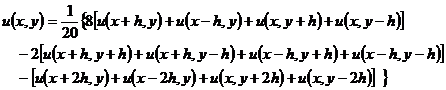 [用调节余数法求节点上解的近似值]  以差商代替Δu时,用节点(i+1,j)(i1,j)(i,j+1)(i,j1)u的近似值来表示u在节点(i,j)的值将产生的误差,称此误差为余数Rij,即