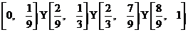 [ Cantor 's triplet ] Represent all real numbers in the closed interval [0 , 1] as ternary infinite decimals * . All those ternary infinite decimals whose digits are not 1 are denoted as T , then T is called Cantor 's triplet . From a geometrical point of view, divide T 0 = [0 , 1] into three equal parts, remove the middle part, and denote the remaining part [0 , ] [ , 1] as T 1 . Also denote [0 , ] and [ , 1] Each is divided into three sections, the middle section is removed, and the remaining section is recorded as T 2 . Continue to get a set family { T n | n ω }, the general set of this family is.